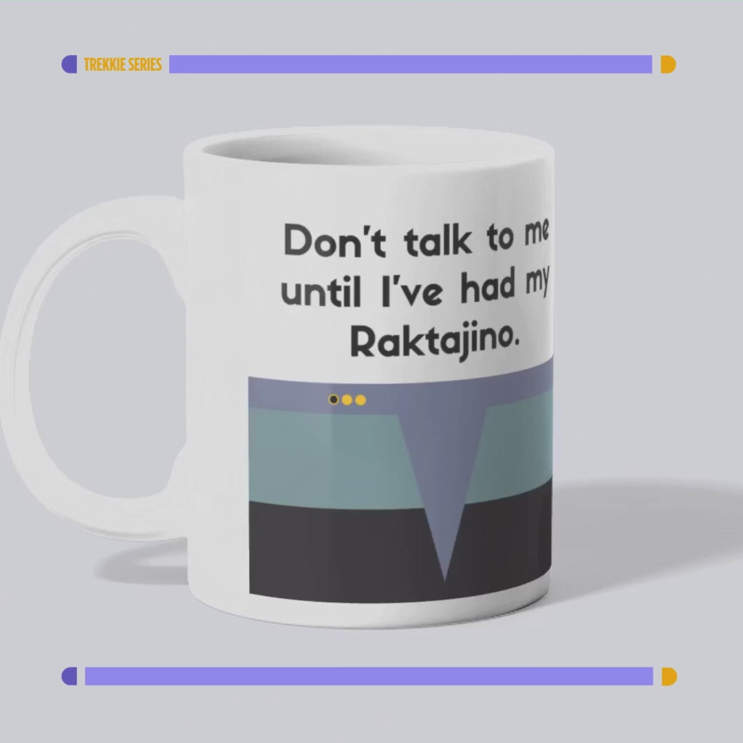 Inspired by Jadzia Dax’s love of Raktajino, this mug is a must-have for DS9 fans who rely on coffee to get going! Featuring a blue Science Division stripe and two and a half pips to reflect Dax’s rank, this mug displays “Don’t talk to me until I’ve had my Raktajino.” Perfect for coffee lovers who need that first cup before socializing!